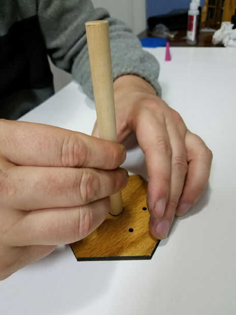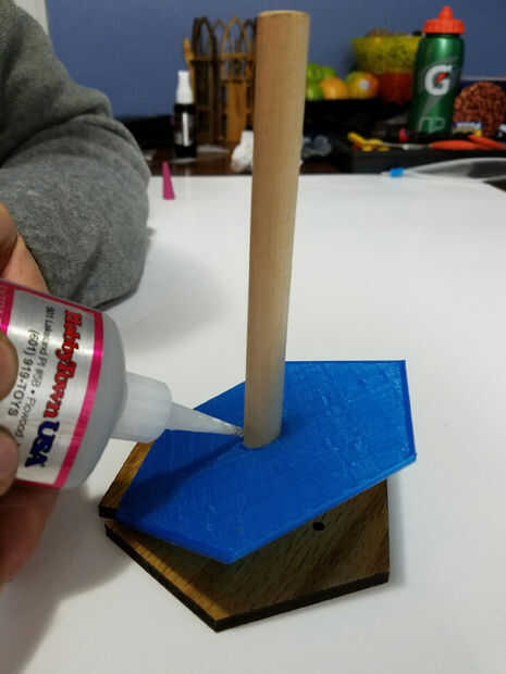 Me pareció más fácil de seguir a la placa superior del vaso. Ajuste el ángulo de 30 grados y asegurándose de que la cara superior de la espiga y el borde superior de la placa eran incluso, agregar una pequeña gota de pegamento para sostener y hacer las comprobaciones. (Al parecer no conseguí una buena foto de este paso).