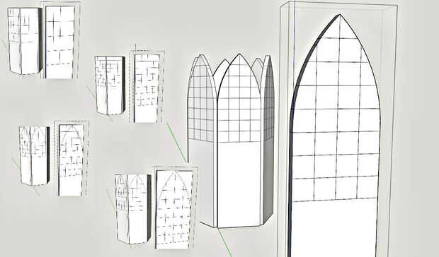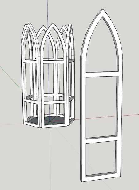 Mover otra copia de su pared hacia fuera lejos de su modelo de trabajo para hacer tus ajustes. Esto le permite trabajar en una función sin todo otro ser en tu camino. Divide el espacio y luego dibujó en arcos hasta que encontré una forma que me ha gustado. Me ha añadido algunos detalles y estructura luego quitar el espacio vacío para que pueda ver a través. Habrá paredes de plexiglás dentro de estas por lo que es aceptable para estos muros se abren.