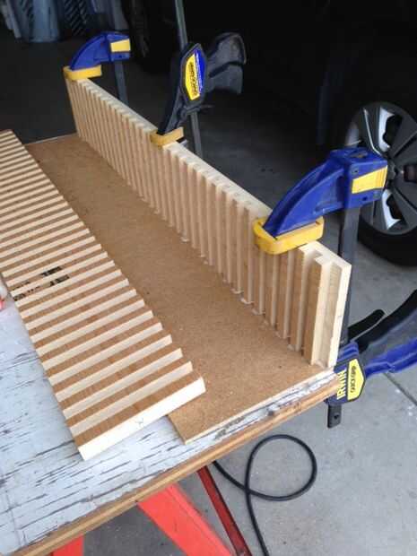 Corté un pedazo de fibra de madera o Masonite para caber a través de la parte posterior de ambas piezas de 1 x 6. Pega y sujeta los lados a la fibra de uno en uno. Ver la segunda foto. A pesar de que todo debe ajustarse, es aconsejable poner una caja de joya de CD en ambos extremos de la torre al sujetar las piezas encoladas en lugar.