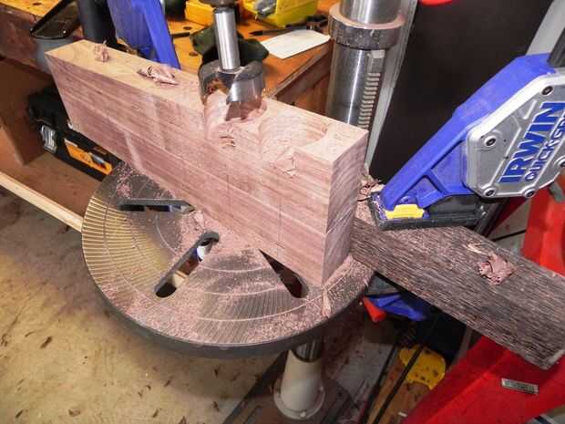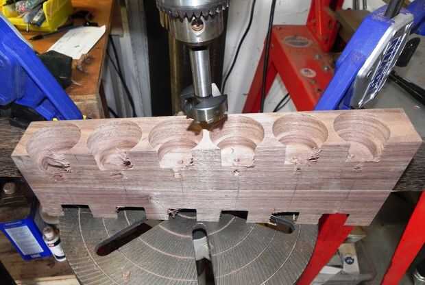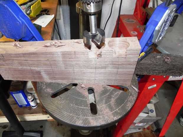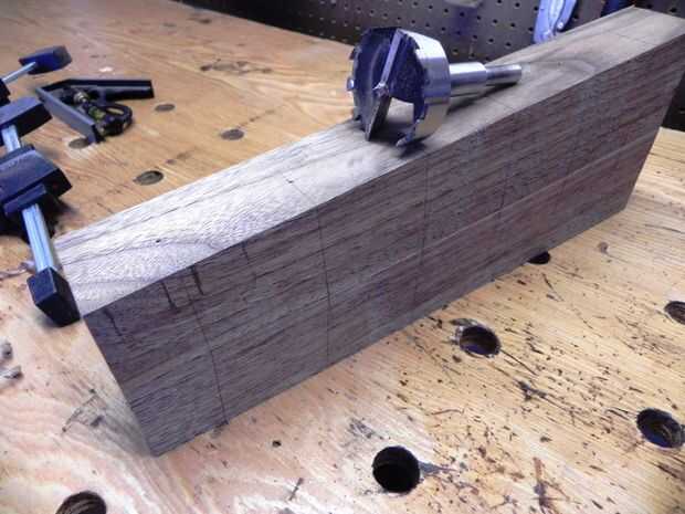 Comenzar con el blanco de la torre y marque de líneas siempre 2.25" de arriba a abajo. Con un 2" pedacito de forstner, marcar su ubicación desde el frente, dependiendo del grosor del bloque y la cantidad de metal que desea han expuesto. Inclinación de la mesa del taladro lo suficiente como para que pueda perforar a 90 grados de la superficie, colocar una cerca para coincidir con los agujeros marcados y cada uno para encajar el puzzle del alesaje. Continuar con los bits 1 5/8" y 1".