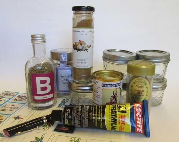 Elegí 5 especias utilizar, 5 tarros de mason pequeño, viejo correo Etiquetas un lápiz y pegamento Loctite (loctite es buen pegamento vidrio y metal)