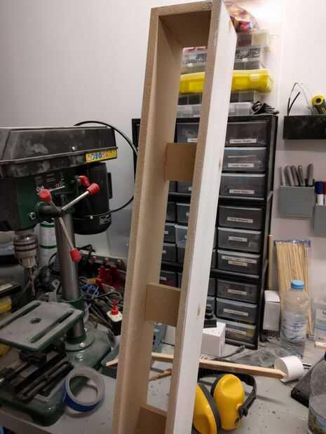 El marco se hace del MDF y utiliza una construcción simple, lados y un par de Cruz llaves pero no espalda que va a quedar contra la pared. No tengo cualquier tiempo suficiente para que la longitud total de mdf así que había construido en dos secciones y se unió a ellos en el medio.