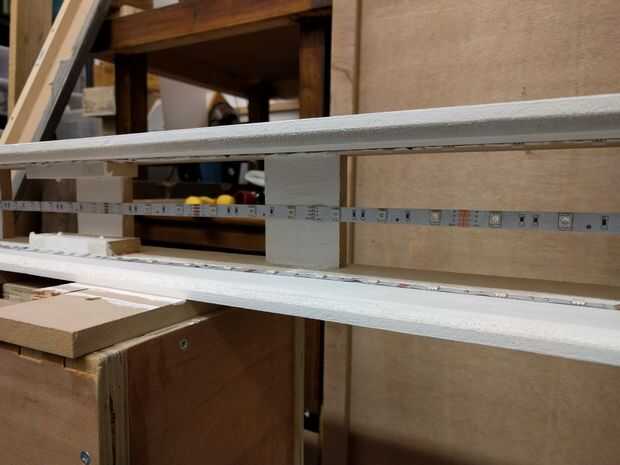 Para la iluminación he utilizado una barato 5m remoto controlado LED franja de luz. Esto se vende como un paquete con una tira de 5m, unidad de control, fuente de alimentación y mando a distancia.