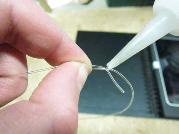 ATA cada uno en cada extremo un nudo cuadrado y cubriéndola ligeramente con pegamento CA.