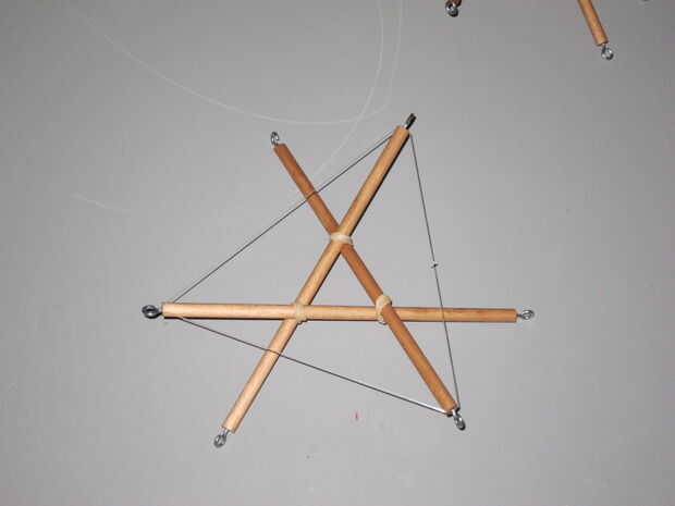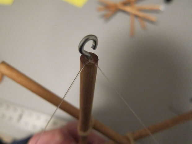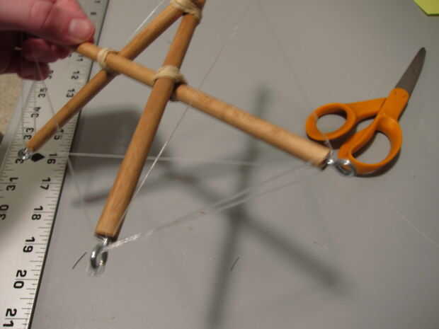 Tomar uno de los 15" lazos de cable de tramo y tramo entre los 3 puntos principales de la tendule. Envuelva el cordón alrededor del gancho de ojo que le resbale. Repita este paso para la parte inferior de la tendule.