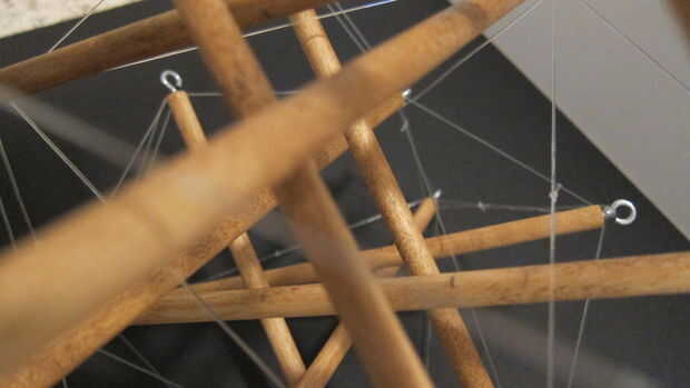esta es mi entrada en el desafío de palillos.Dar crédito donde crédito es debido:Cuando empecé a pensar en este reto mi primera idea fue construir una torre de tensegridad usando los palillos. Hice una búsqueda rápida de google y no sabes... había