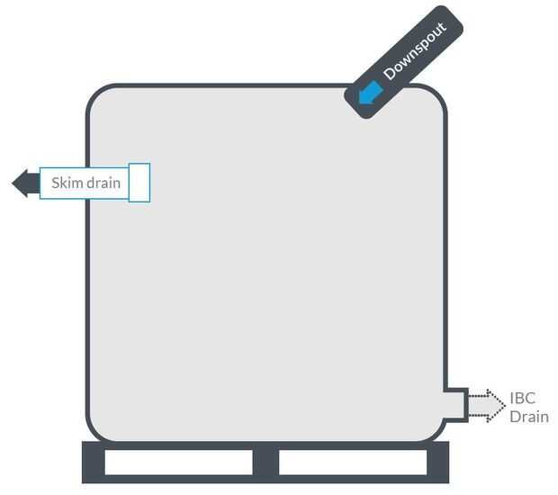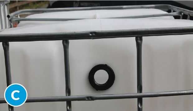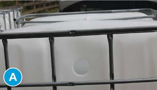 Agujero de taladro para la mampara del drenaje descremada aproximadamente 6" desde la parte superior del tanque en el centro de la pared opuesta del IBC válvula de desagüe.