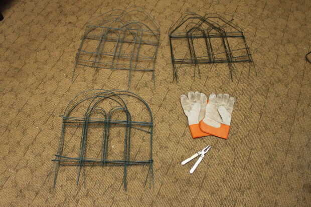 También en la foto son unos guantes de trabajo y un conjunto de pinzas, que puede que desee si las secciones de la cerca son realmente sucias o en forma particularmente mala. Las pinzas son muy útiles para doblar el alambre.
