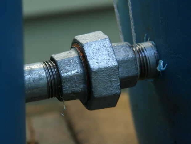 Una posible combinación de accesorios es pezones cerrados (corto) y las tuercas de la pipa. Pero no pude encontrar las tuercas de la pipa, usé los acopladores en su lugar. O, era el plan. Resulta que yo era capaz de usar brocas de pala estándar para perforar los agujeros y luego simplemente atornillados los pezones en el plástico. Cortaron sus hilos y produce accesorios a prueba de agua. Creo que 3/4" para tubo de 1/2", 1" para tubo de 3/4. Entonces, usted necesitará una Unión para conectar los dos barriles.
