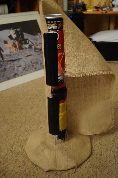 Otra pieza del hessian se utiliza para cubrir la torre. Al principio quería utilizar el pegamento para darle un acabado de aspecto limpio, pero he encontrado que pegamento no era muy eficaz así que recurrí a la vieja no seguro de la cinta del conducto. Antes de envolver completamente la torre, la electrónica necesita ser instalado, como usted tendrá que cortar un pequeño agujero en el tubo.
