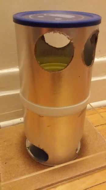 Esta imagen es el primer prototipo. ' Tachatte tomó unos 5 minutos para entender cómo funcionaba pero Mimi tuvo 30 segundos para odiarme para siempre. Está hecho de dos latas de café. La comida va en el interior copa amarilla. La Copa se sostiene en la tapa de la parte inferior, que es cortado a 3 "rayos" por lo que el alimento puede caer... Mira la foto, la cosa es más fácil mirar que leer para entenderlo...