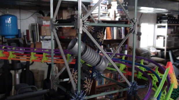 esta es mi primera máquina de la bola, creo que es bastante bueno para mi primero que utiliza Tornado96 y Shadowman39 de alternando elevación del brazo. Había basado en una trayectoria que se enrolla alrededor de una pequeña torre que las bolas rueda