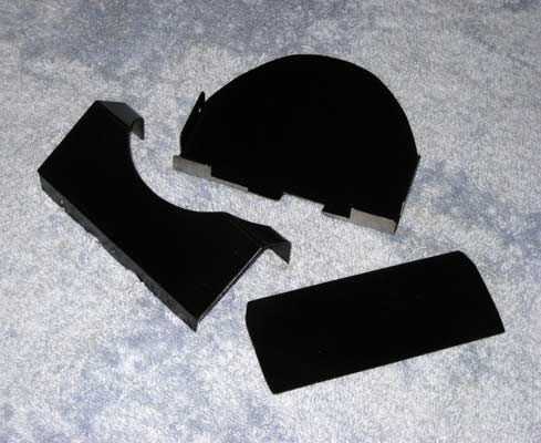 El panel frontal cubre la caja de cambios y es un simple 4-5/8 "x 2" rectángulo de 0,064" aluminio cortar para caber. Se sienta flojo en los espacios de lo puntos de montaje frontal de plástico. Las esquinas superiores podría ser necesario afeitar, dependiendo de cómo el trabajo de la parte superior del cuerpo termina montaje (visible en la mía por encima).
