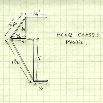 La parte trasera llena el espacio entre la caldera y el chasis, por lo tanto su forma es más compleja. Ángulos hacia arriba desde la parte inferior de chasis siguiendo el contorno del chasis, luego hacia la brida del parte superior del chasis. La curva de la caldera es transferida en y corte. Trazado de la caldera por ojo utilizando una regla, luego cortar con tijera/tijeras/metal-cortadora. Tomó unos ajustes de prueba. Tres agujeros se perforan a través del chasis desde abajo y el panel asegurado con tornillos de rosca chapa.