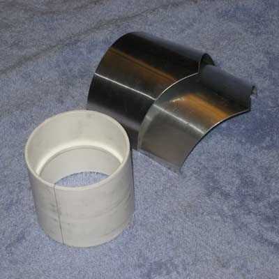 Después de hacer un segmento de la cola, se convirtió en la plantilla para los demás. Curva los segmentos usando un acoplamiento de tubería de PVC de 3" como una forma. Entonces recortan segmentos hasta longitud.