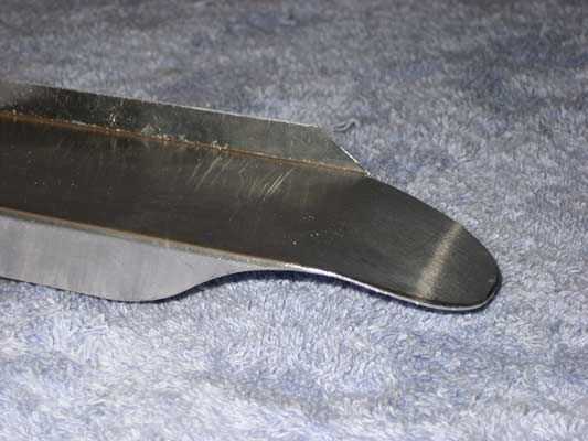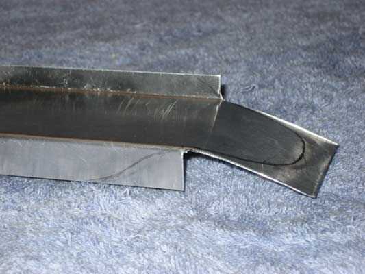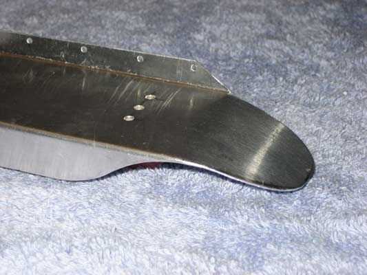 Quitar un par de pulgadas de brida de la frente/parte posterior permite formar el guardabarros. Bosquejó una suave curva que terminó en el reborde externo, áspero cortar con unas tijeras de metal y presentó los bordes lisos.