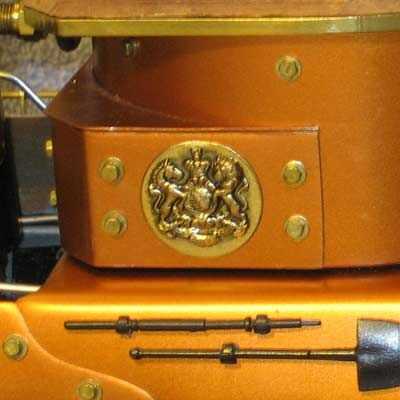 Toques finales involucrados doblando algunos 1/8 latón-canal u para ocultar el aluminio y añadir pasamanos. Comentar posiciones para barras de 15mm (igual que las defensas), los orificios perforados y equipados/soldar las rejas de varilla de latón de 1/16. Después de la pintura, los lados de la torreta están adornados con crestas de León de algunos botones de latón.