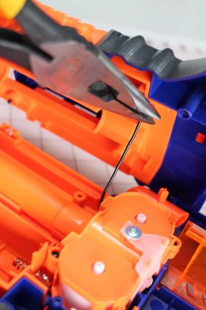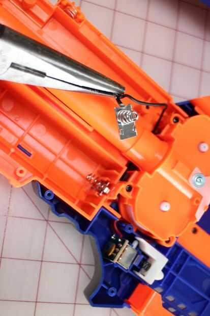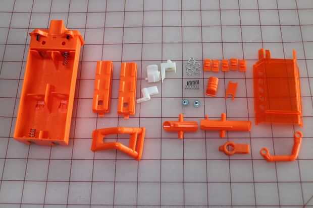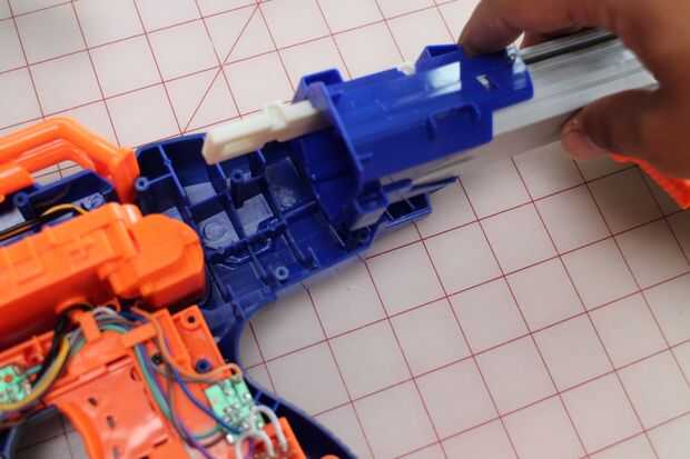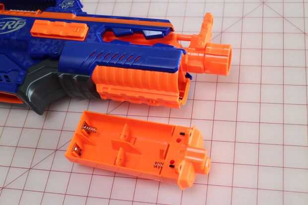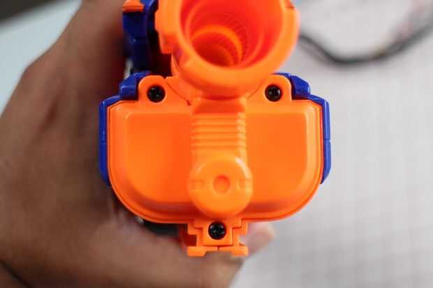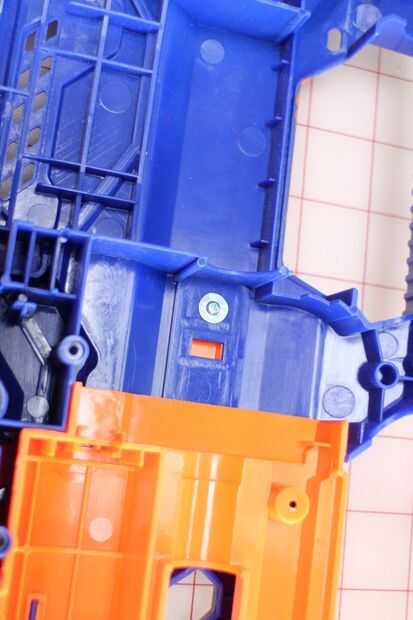 La caja tiene cuatro tornillos cautivos que deben de ser aflojados para separar completamente el cuerpo de la pistola en dos partes. Una vez fuera el caso, puede ser fijado a un lado, puesto que la torre entera se alimenta por una sola batería de litio de todos modos. Las dos mitades del cuerpo de la pistola sólo están conectadas por el cable negativo de la batería, así que necesitarás sacar para separar completamente el caso. Una vez que se divide el cuerpo, deje que el plástico suelto caerá y eliminar la acción de la cola.