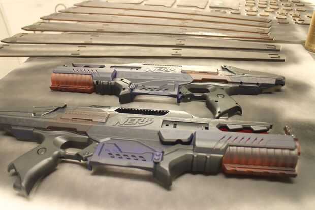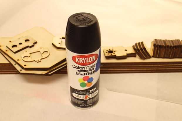 Este paso es totalmente opcional, pero dar la torreta de un poco más intimidante. Con la electrónica quitada, decidí cubrir casi todo en dos capas de pintura negra + cartilla. También es un buen momento para cortar las placas de la pierna y el cuerpo de madera contrachapada de 1/4". Yo he conectado los perfiles del vector anteriores.