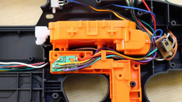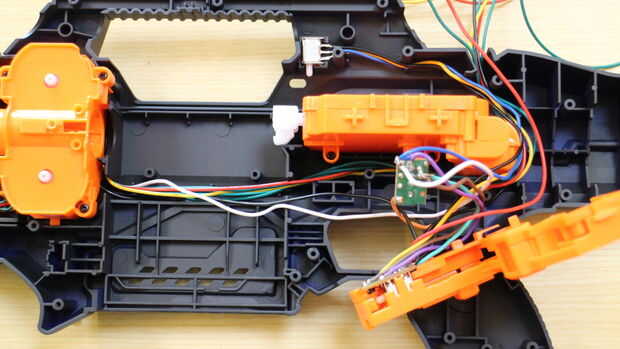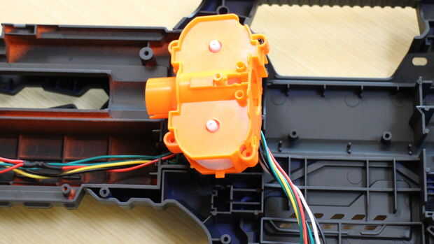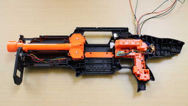 Con la pistola de pintar, su circuito modificado y el sensor de la placa construida, es hora de empacar todo en el cuerpo de la pistola. Hay muy poco espacio libre alrededor del mecanismo de tambor, los cables de los LEDs y el sensor de PIR a necesitar ser pescado a través de su base. Después de eso, los cables de alimentación de la pistola y el sensor deban ser retenida por la pieza original del retenedor, que se puede ver entre los dos mecanismos en la segunda foto. Los cables se extienden hacia fuera de la parte superior de la pistola (pronto a ser la parte inferior) cerca el actuador linear. Con todo en su lugar que te sugiero probar las conexiones de alimentación una última vez antes de sellar el arma hasta que es bastante tedioso enroscar y desenroscar.