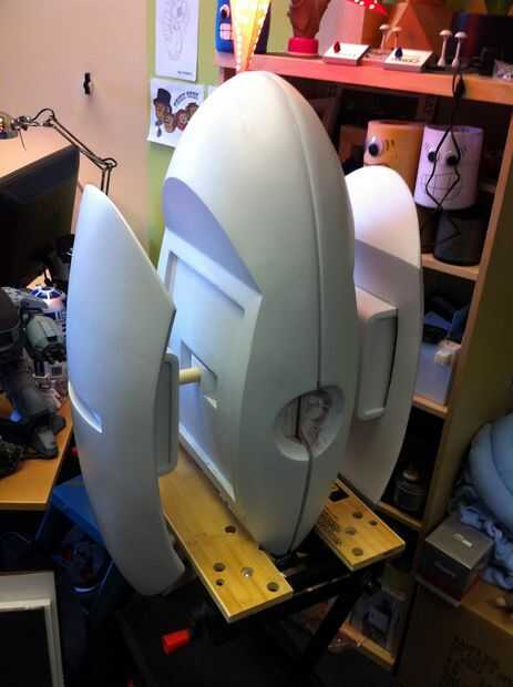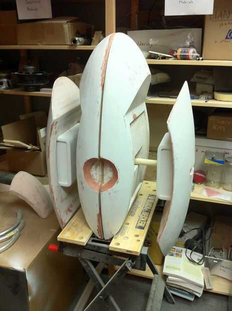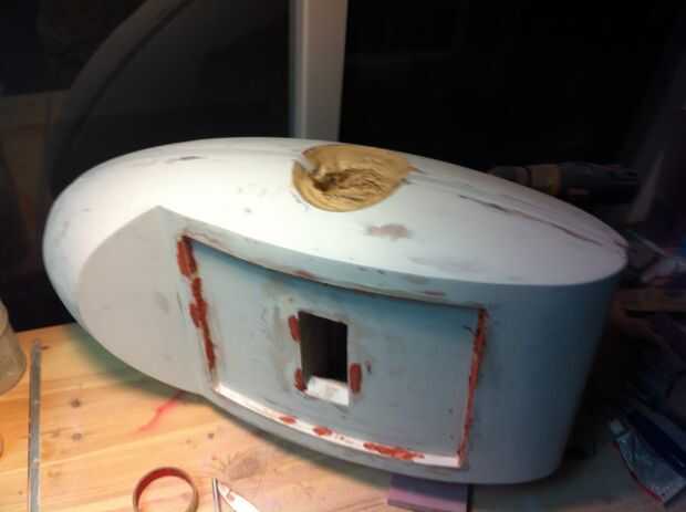 Mientras estoy hablando de la costura central que debo comentar en el bolsillo del ojo. El ojo es una pieza interesante de la geometría - no es exactamente un cono y si usted comete el error de asumirlo es uno acabará mirando demasiado estrecho. La mejor manera de crearlo es cortar un agujero de 3 pulgadas mientras que ambas mitades están montados y dibuje un círculo 1" fuera de que. Mida desde la parte inferior del agujero y trace una línea alrededor del interior del agujero. Si se mide desde la parte superior del orificio, la línea no será plana. Ahora corta a dos líneas en un patrón radial utilizando una sierra y cutáneo. Me encontré en algunos problemas para obtener esta superficie lisa la primera vez y acabó cortando partes significativas de la espuma en esa área y reemplazar con una mezcla de epoxy/micro-esfera. Usted debe intentar su mejor para hacer esta parte se ven bien ya que es el punto focal de la figura.