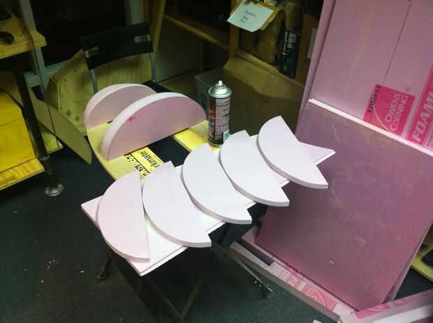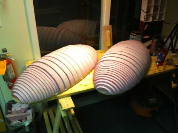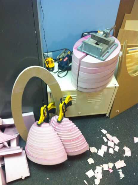 Una vez que todas las partes fueron cortadas, utilicé pegamento de aerosol Super 77 construcción de subconjuntos del cuerpo principal. Eran tan grandes como mis pinzas podrían alcanzar, y tuve algunos problemas con las secciones de laminación a las juntas que no fije. Las secciones de espuma entonces estaban pegadas a hojas de MDF de 1/2". Estas hojas son grandes elipses con el centro quitado y punta de la parte inferior cortar. La punta se retira porque en la torreta de Portal, hay una gran parte eliminada donde las piernas se encuentran con el cuerpo. El centro se corta solo para ahorrar peso. En el área donde está la punta del corte que las rebanadas de descansan sobre una pieza delgada de espuma en lugar de MDF.