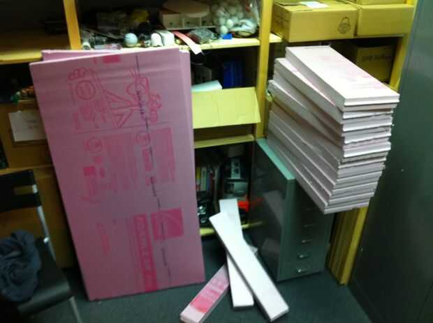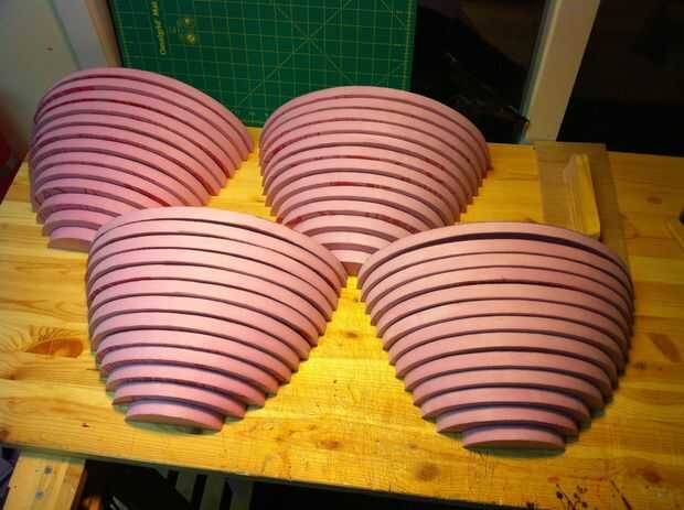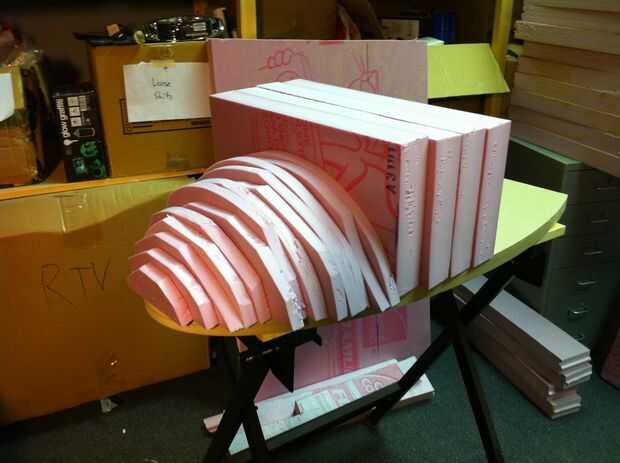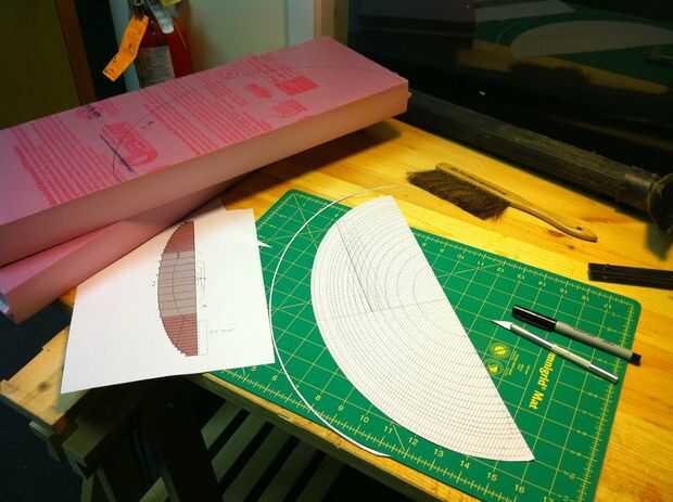 Al colocar los perfiles, empecé con el más grande - seguimiento 4 formas en espacios rectangulares cortadas (derecha e izquierda, arriba y abajo). Una vez que se trazaron, corté mi impresión hacia fuera hasta el siguiente perfil menor y traza otra formas 4. Creo que hubo 18 perfiles total, haciendo 70 lonchas de espuma (sólo había 2 pedazos de centro, no 4), utilicé un largo hoja cuchillo Olfa áspero hacia fuera las rebanadas y cortan ellos más de lo que a su forma final en un pequeño juego de mesa. Entonces les llevó hasta el contorno en una lijadora de banda de la mesa. Hubiera preferido utilizar espuma de flotación azul en lugar de la espuma de aislamiento rosa ya que es menos denso y formas más fácil. La espuma rosa es demasiado elástica y tiende a fundirse en un alquitrán negro cuando arena agresivamente.