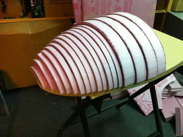 * Más tarde me di cuenta de que sería una buena manera de crear una forma aproximadamente oval de la base cortar una elipse en la forma de la vista lateral de la torreta en un pedazo pesado de MDF en la parte superior una gran caja hermética y luego poner una hoja caliente de estireno sobre él. Se debe caer en ese hueco y podría ser jalado mas a la caja con una ligera presión de vacío. Se puede controlar perfectamente el perfil, pero he escuchado esta técnica usada antes para hacer cúpulas para R2-D2 los robots y los cazadores de mitos utilizan un principio similar a la chapa de forma en el episodio 'Torpedo Tastic'.
