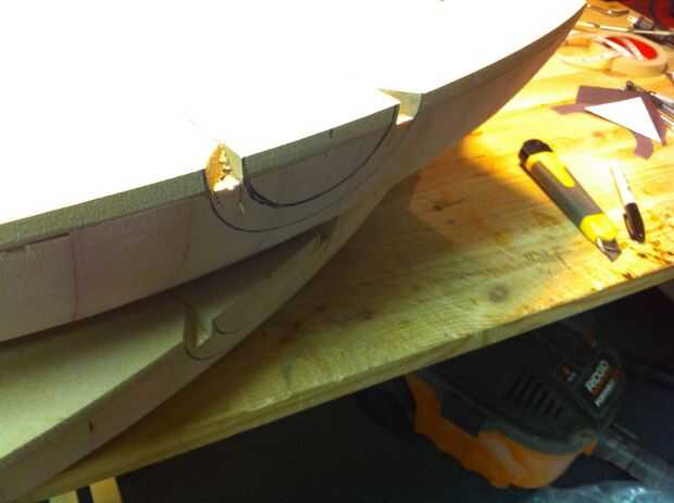 Después de que pegan las piezas de ala rota hacia atrás, corte las áreas de la muesca de la pierna muy fácilmente con una sierra japonesa tire. El "desecho" de la muesca de la pierna es realmente volver a permite crear rodilleras de la torreta. Es necesario cortar cada trozo por la mitad, pegue los 2 juntos para crear la rótula trasera y entonces también rellenar las zonas cóncavas con más espuma.