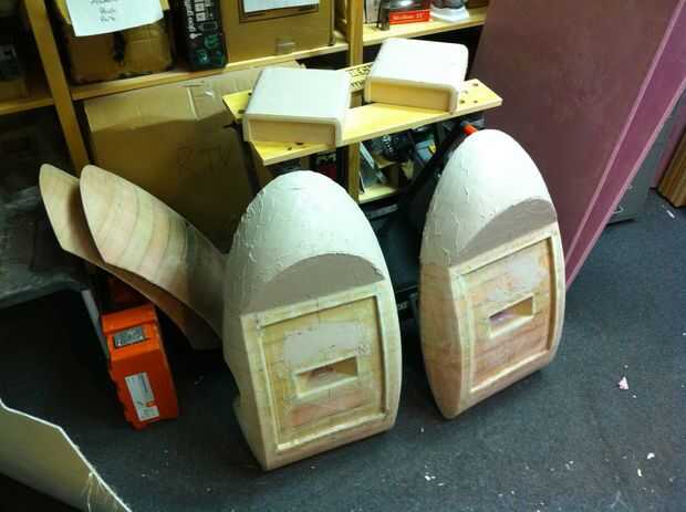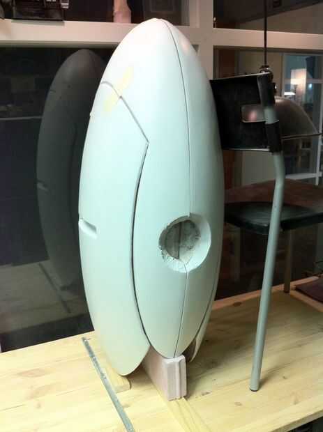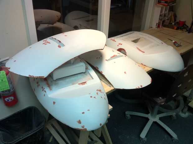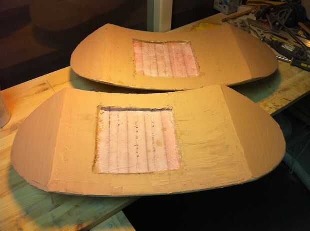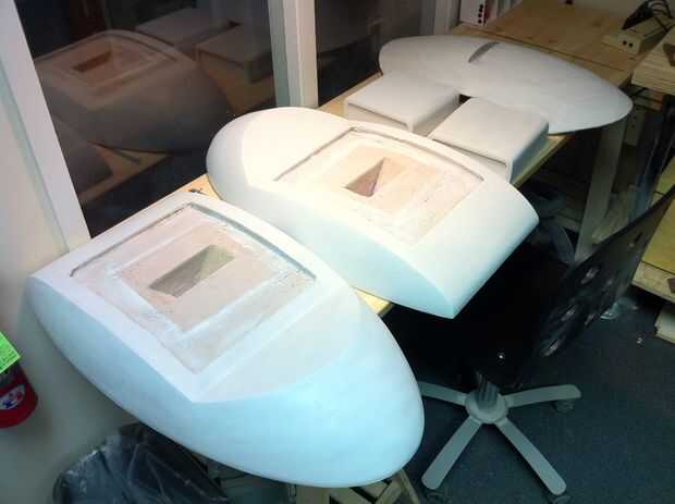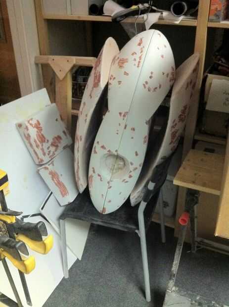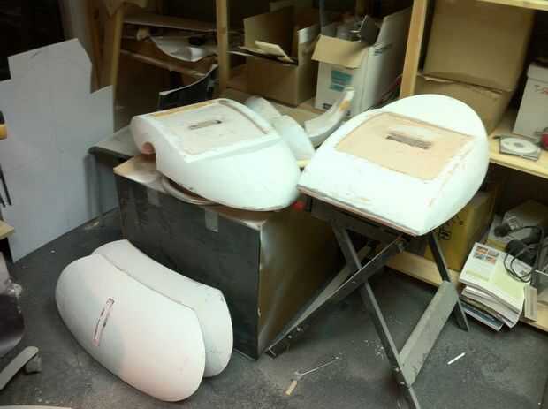 He trabajado en todas las partes en diferentes fases como algunas áreas eran más fáciles de terminar que otros y algunas partes, como el interior de las alas, necesitan para cumplir con limpiamente con el resto. La superficie externa de las alas y el cuerpo principal eran mi objetivo principal ya que son la superficie más grande que se mire. Las vainas del arma fueron muy fáciles ya que había aprendido evitar la reutilización de desechos de fibra de vidrio. Los interiores de las alas eran particularmente difíciles debido a que son las superficies grandes, ligeramente cóncavas y el Hot-wire cutter hizo un trabajo tan terrible del corte. El centro de cada una de estas caras tenía un gran agujero en la fibra de vidrio y bolsillo poco profunda en la espuma que sostendría las vainas del arma con un ajuste de fricción. Los bordes de este agujero eran un poco bruto, debido a que me quedo casi sin fibra de vidrio.