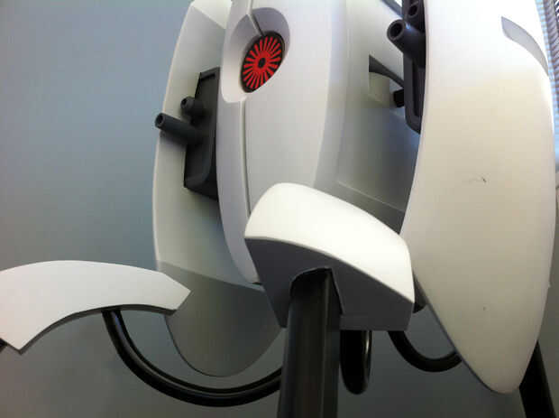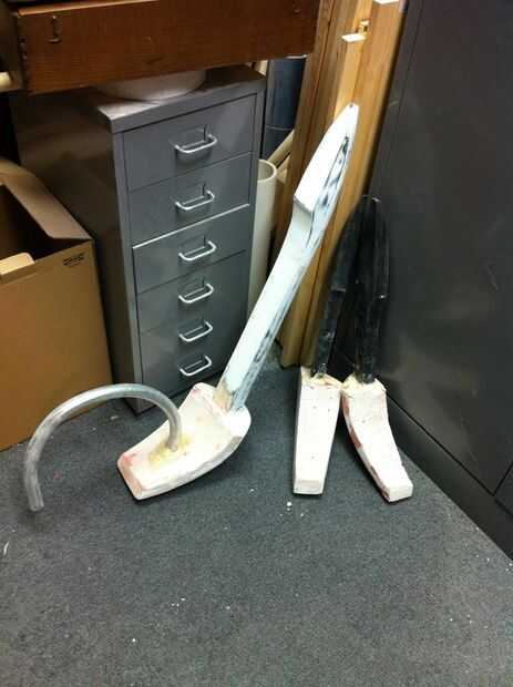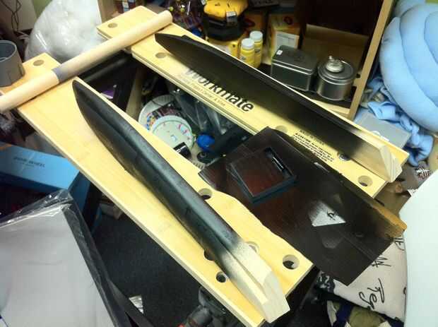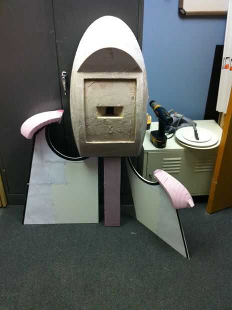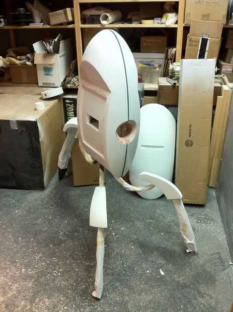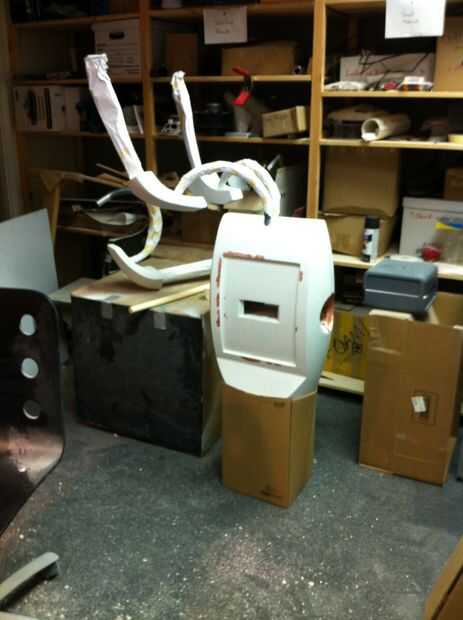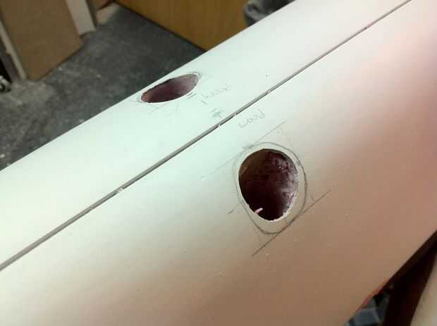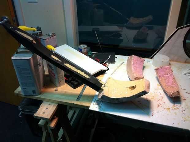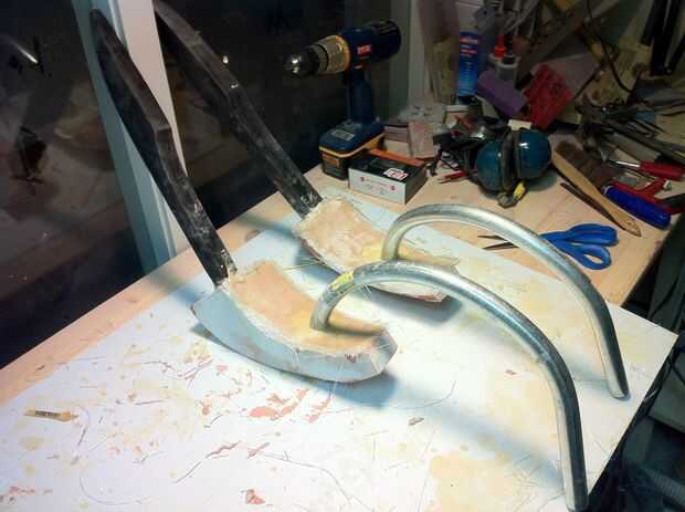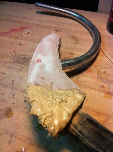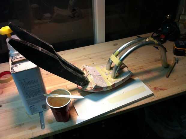 Para unir las patas de madera y piezas de tubo de metal a las rodilleras talla bolsillo para la espiga de la pierna encajar en. Recuerda poner la rótula y las piernas juntas en lo que parece como pares opuestos - la pierna izquierda va en la rótula derecha de modo que se enfrenta a la parte plana hacia fuera. Se pega con una gruesa mezcla de epoxy y microesferas. Para los tubos metálicos perforé y dremeled hacia fuera un agujero redondo para que encaje en. Tomó mucho de trucaje y la plantilla de configuración para asegurarse de que todo lo establecido en la posición correcta. También 2 agujeros cerca del extremo de los tubos perforados y poner tornillos a través de ellos para crear más de un ancla en la espuma y epoxy. Una vez que se había curado del epoxi acabé cubriendo las rodilleras en fibra de vidrio.