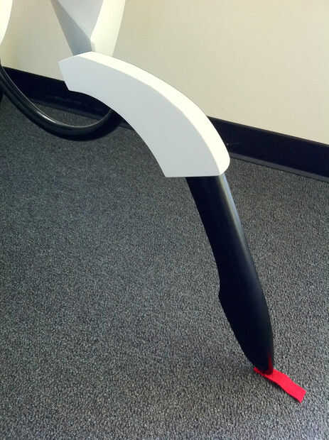 La parte de tubo de metal de las piernas se hacen de 3/4" acero conducto eléctrico que está doblado a 12" de diámetro usando un doblador de conducto de contratistas. El frente piernas son están doblados un poco menos de 180 grados mientras que la pata trasera es más de 200 grados, que es más que el doblador está diseñado para. Esto significa que tenía que trabajar el tubo en un poco de una hélice, que trató de aplanar, pero realmente no funciona. Una vez que el metal se dobla se convierte mucho más difícil y se convierte en imposible de ajustar. Corté la parte de la tubería que conecta con las rodilleras justo al final de la curva. El otro extremo tiene unas pocas pulgadas de tubo recto que permite que las piernas encajar en los agujeros en el cuerpo.