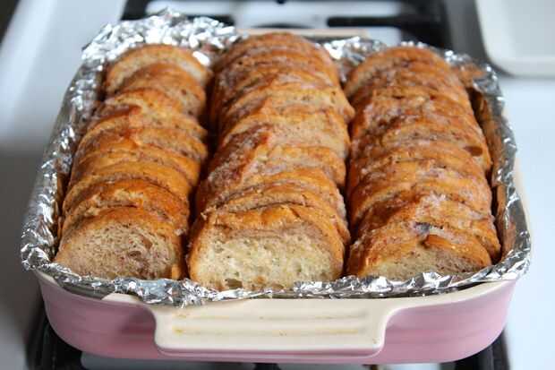 Línea de la bandeja con papel de aluminio y rociado con aceite. Cortar el pan en 3/4 pulgada rebanada piensa y alinear en la sartén. Si el pan es super seco y viejo, considere agregar 3/4 taza de leche en lugar de 1/2 taza.