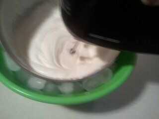 Continuar batiendo a velocidad media hasta que formen picos en el glaseado.  Esto va a tardar un rato!  Se puede acelerar poniendo el bol sobre otro bol lleno de hielo.  Ha ayudado mucho!