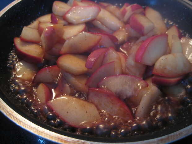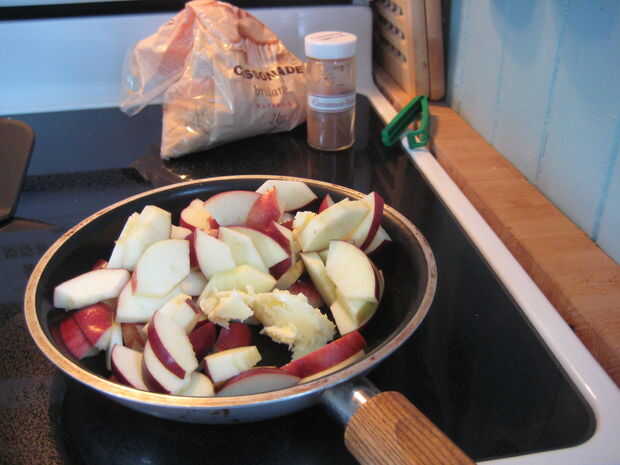 Lavar, base y cortar las manzanas, dejando la piel en. Poner los trozos de manzana en una sartén con mantequilla y comenzar a salteados a fuego medio-alto. Cuando las manzanas al vapor, agregar el azúcar y la canela y revolver.