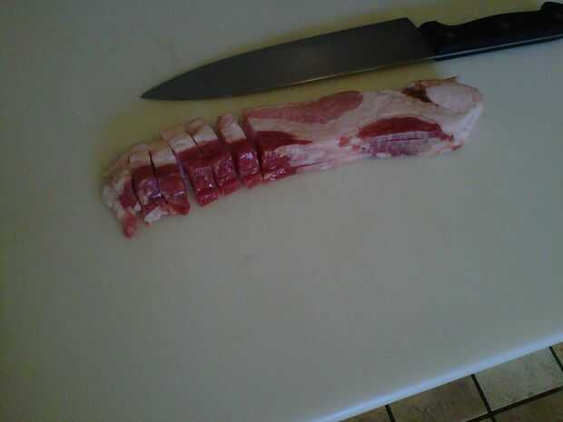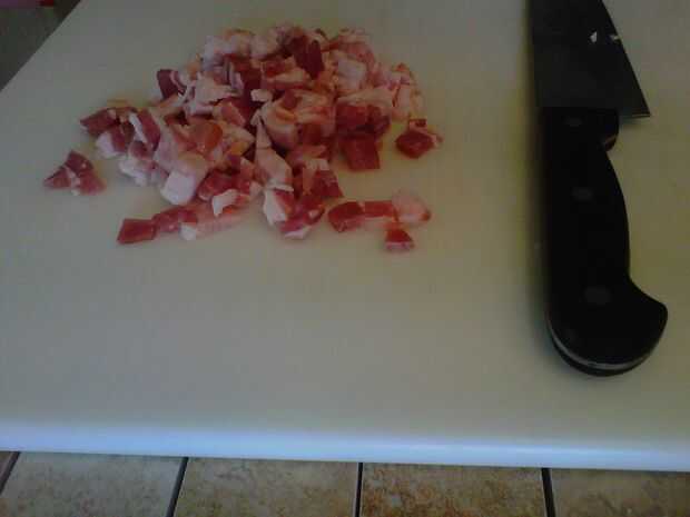 3. rebanada de su tocino congelado en cubos pequeños , aproximadamente de 1/4 de pulgada cuadrada. Utilice una tabla de cortar para carne para evitar la contaminación.
