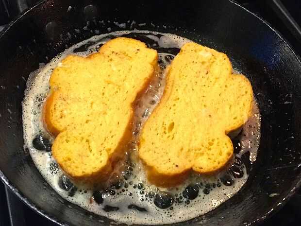 Añadir las 2 rebanadas de pan a la sartén precalentada. Freír el pan hasta que estén dorados marrón, 2 a 3 minutos por cada lado.