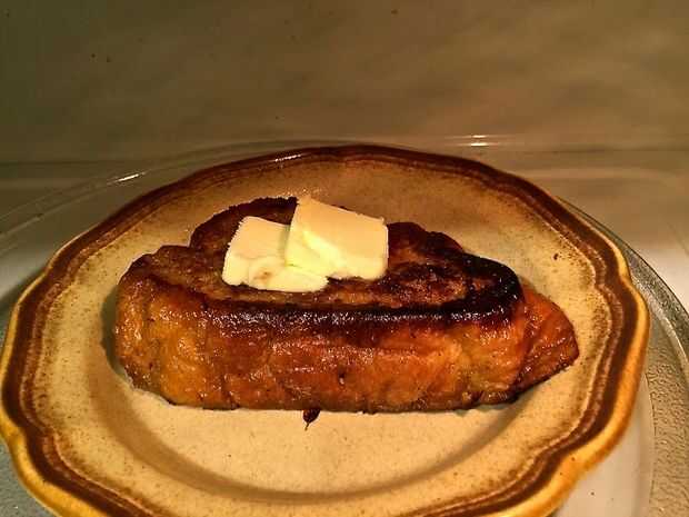 Unos 45 segundos en calefacción, voltee la torrija, agregue la mantequilla. Continuar recalentamiento hasta que se suavice la mantequilla.