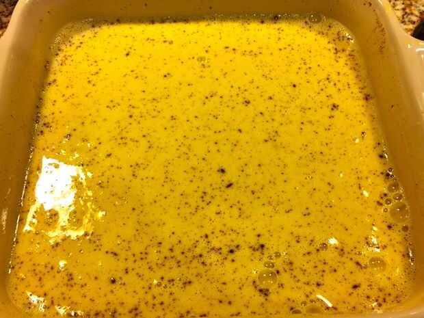 Vierta la mezcla del flan en una bandeja cuadrada de 8 "x 8". Ponga a un lado.