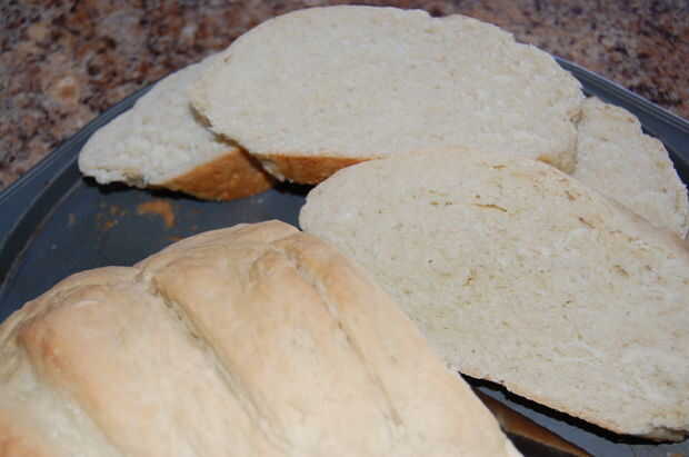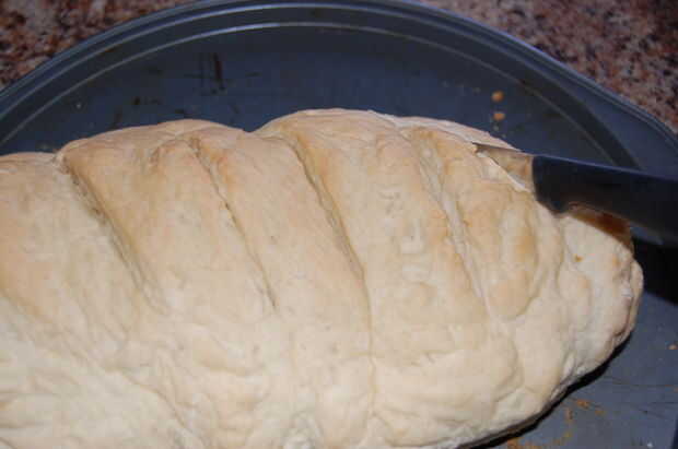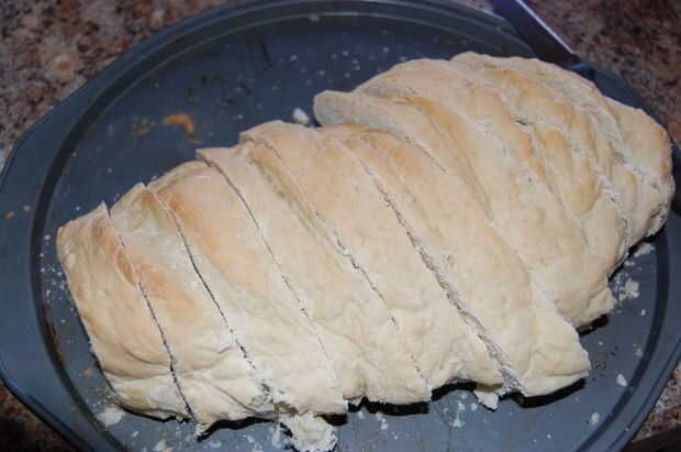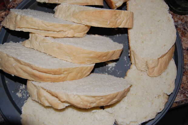Precalentar el horno a 325 grados.  Mientras se calienta, cortar el pan en rodajas gruesas de bonitos. Poner éstos hacia fuera en una bandeja de hoja (como se puede ver en la imagen es aceptable si se superponen un poco) y coloque en el horno durante cinco minutos.  Esto seca un poco y ayuda a absorben el líquido.