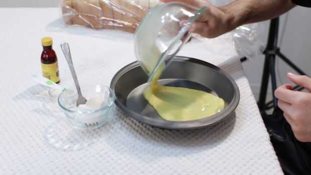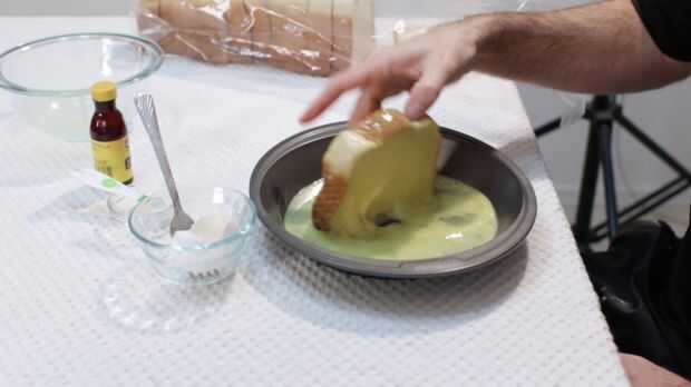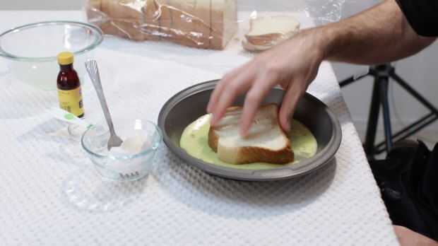Ahora tomamos la masa y colocar en un recipiente poco profundo o un pan. Me gusta usar un molde de tarta. Envase de tupperware superficial funciona muy bien así. Pues mojar tus rebanadas de pan, asegurándose de cubrir ambos lados y drenando el exceso hacia la Panamericana/tazón de fuente.