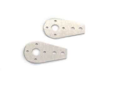 Fije el cuerno del servo circular a un soporte de aluminio. Usé un Lynxmotion ASB-19B, con el último agujero en su extremo estrecho cortado para el despacho. Originalmente usé los cuernos de plástico brazo servo (ver en la imagen en el servo superior; el cuerno de aluminio se ve en el servo de fondo), pero éstos no eran lo suficientemente fuertes en condiciones de uso para las dos placas inferiores, que llevan la carga más alta.