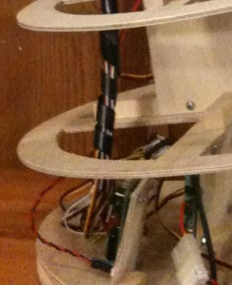 En la base, os adjunto el controlador del servo a la canalización vertical con unos separadores. Los cables de los servos están conectados aquí en el controlador de servos. Escribe que canal a que cada cable está conectado. Había probado el torso y el controlador con el controlador separado del cuerpo y montado en la columna más tarde. Cuando los cables se conecta, nada funcionó! Había conectado los cables boca abajo en el controlador. Documentar todas las conexiones!