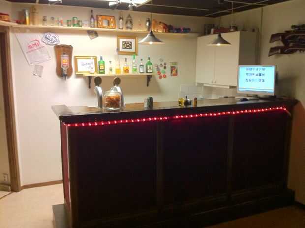 de todos modos, la barra se hace desde cero utilizando sólo tablones sin tratar, tornillos y tela. Por ejemplo, el borde es tablones utilizados para revestimiento de casa que ha sido planeado y pegados juntos. La mayoría de las piezas de madera ha sido teñido y lacado para darle un aspecto brillante.