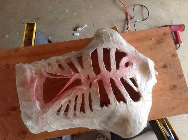 Agregué tiras adicionales de las bolsas de la zona abdominal y reducido para dar la apariencia de los tendones y fibras musculares restantes. A continuación, añadí algunos acentos de color claro ligeramente áreas de pintura al azar: rojo alrededor del corte abdominal que insinúan una evisceración reciente y negro para mostrar alguna edad para el torso del cadáver.