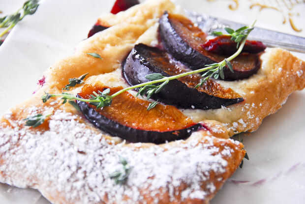 Receta: para 2 personas, como almuerzo o cenaIngredientes:5 Ciruelas frescas púrpura, con una piel intacta, cortan en 4 (piedra quitado)4 cucharadas de un afrutado AOVE (aceite de oliva Virgen Extra)1 cucharada de vinagre de vino tintohojas de 75 gr