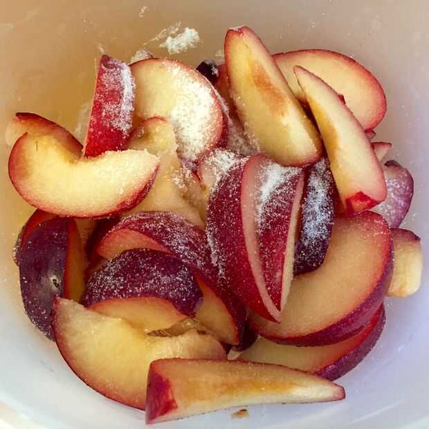 Ponerlas en un separado tazón de fuente, tazón de fuente, tazón de fuente, tazón de fuente y uso de algunos (~ 1-2 cucharadas) de azúcar que se llama para la mezcla y Espolvorea sobre las ciruelas. Esto hará a "desmoronarse" un poco y suelte su jugo. Sacudir por lo que estan todos recibiendo algunos amantes de azúcar ' y reservar.