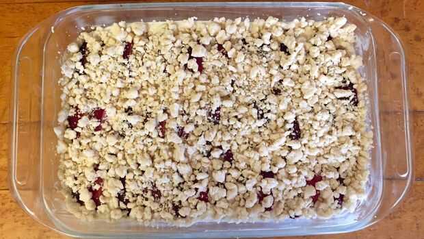 A continuación tendrás que distribuir bien el streusel por encima. No sugiero hacerlo con las manos desde que a veces los hace agruparse en una gran bola, a menos que estás siendo muy suave. Trate de usar una cuchara o verter directamente en el recipiente que los mezclan en. Cubra uniformemente la superficie.