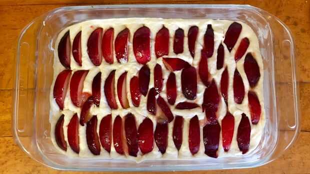 Agarra el pan con la masa, ahora quiere colocar sus rebanadas de ciruela. Ir todos modos que te gusta y repartirlos equitativamente a algo. Quiere estar sentado en el batter no en la parte superior!