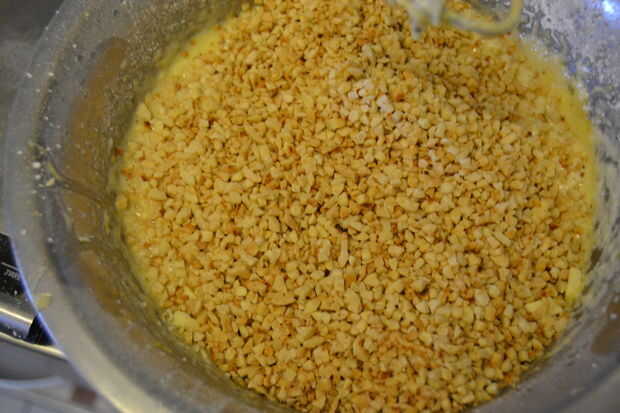 Agregar primero el chocolate y las almendras tostadas a la masa y revuelva hasta incorporar. Esto es importante: las almendras aún calientes derriten un poco el chocolate picado.